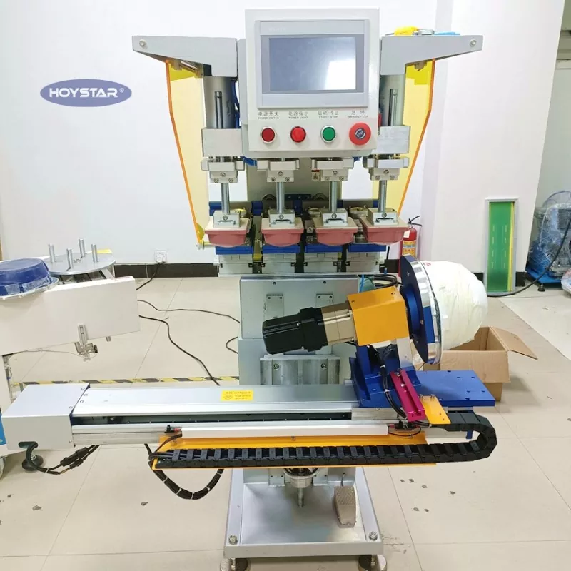 Kup dostosowaną 4-kolorową maszynę do tampodruku do kasku firmy Dongguan Hoystar Machinery Co., Ltd., która jest jednym z producentów i dostawców w Chinach. Ta 4-kolorowa maszyna do tampodruku HOYSTAR do kasku, wyposażona w panel sterowania z ekranem dotykowym PLC, jest łatwa w obsłudze. Ta maszyna jest wyposażona w sterowanie silnikiem serwo do automatycznego drukowania rotacyjnego, oferując opcje drukowania po 1 stronie, 2 stronach lub 4 stronach hełmów. Stół roboczy porusza się w lewo/prawo, anioł obrotowy, wysokość produktu można regulować. Każda głowica drukująca jest regulowana niezależnie i może być konfigurowana oddzielnie.