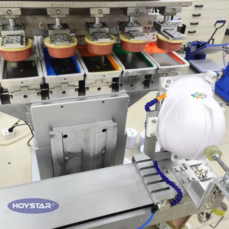 6-kolorowa maszyna do tampodruku do kasków ochronnych, wyposażona w stół roboczy, może drukować w 6 kolorach jednocześnie.