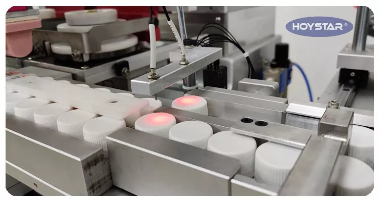 Maszyna jest skonfigurowana z systemem obróbki płomieniem, który zwiększa przyczepność atramentu do powierzchni zakrętek butelek, poprawiając trwałość druku.