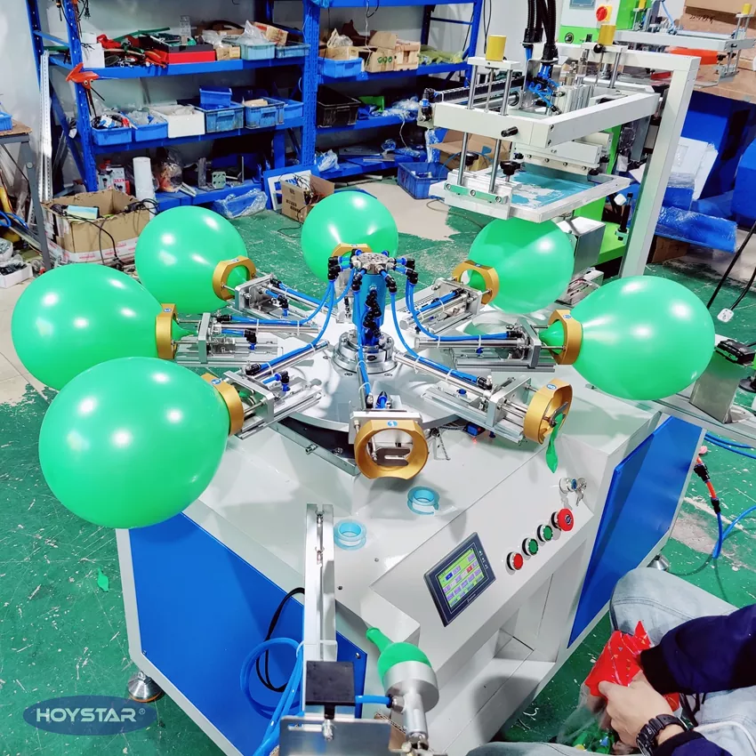 Jako profesjonalny producent w Chinach, chcielibyśmy zapewnić Państwu wysokowydajną jednokolorową maszynę do sitodruku na balonach lateksowych HOYSTAR. Nasze maszyny wykorzystują sterowanie PLC i ekran dotykowy i są wykorzystywane głównie do drukowania różnego rodzaju balonów lateksowych. Maszyna może drukować po 4 stronach balonów i jest wyposażona w suszarkę, która może dobrze wysuszyć atrament.